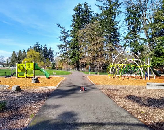 Located off Scholls Ferry and SW 88, Vista Brook has the best set up for younger kiddos. Situated in a quiet neighborhood, it features paths connecting it to the Fanno Creek Trail. There’s a smaller train play structure for toddlers and a second structure that’s great for those a few years older. In addition, it has a sandbox, a wetland area with a lookout, and a large green space with paved pathways perfect for riding a bike or scooter.