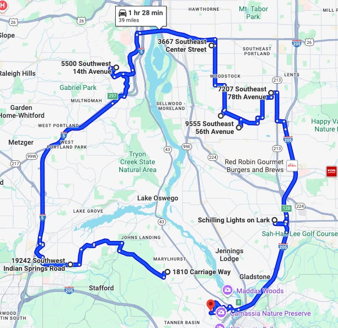 If you can’t count on your little ones remaining cheerful for three hours of Halloween fun on the full loop, try this shorter route specific to SE Portland instead. It still includes many of the best displays from the longer route. Rice would like to share credit for this route with Jessica Reisterer-McQuiston, who helped vet many of the homes.