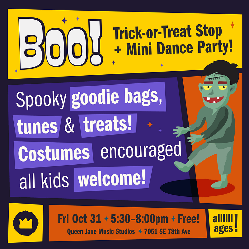 Drop by Queen Jane on Halloween night for a neighborhood-friendly stopfull of spooky fun! We’ll have goodie bags for the kids, a mini dance floorwith cheerful Halloween jams, and a sweet treat buffet for everyone to enjoy. Costumes encouraged, smiles guaranteed—it’s a cozy, community-style celebration that’s friendly, festive, and free.