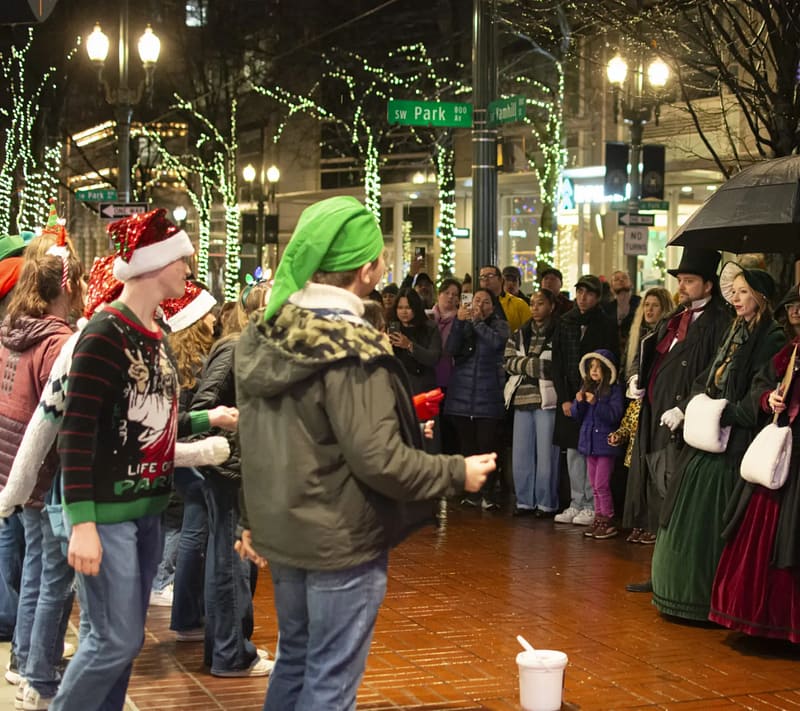 The 11th Annual Great Figgy Pudding Caroling Competition, hosted by KGW’s Drew Carney, is a fun, festive, and joyful competition bringing hundreds of carolers to a ten-block radius the surrounds Portland’s Living Room®. Carolers perform in front of Downtown’s favorite nearby shops, restaurants, and hotels with the top three caroling groups holding a “carol-off” at The Square. Members of the public can participate in this FREE event by registering to perform with a caroling group or by visiting performing caroling groups to vote for your favorite.