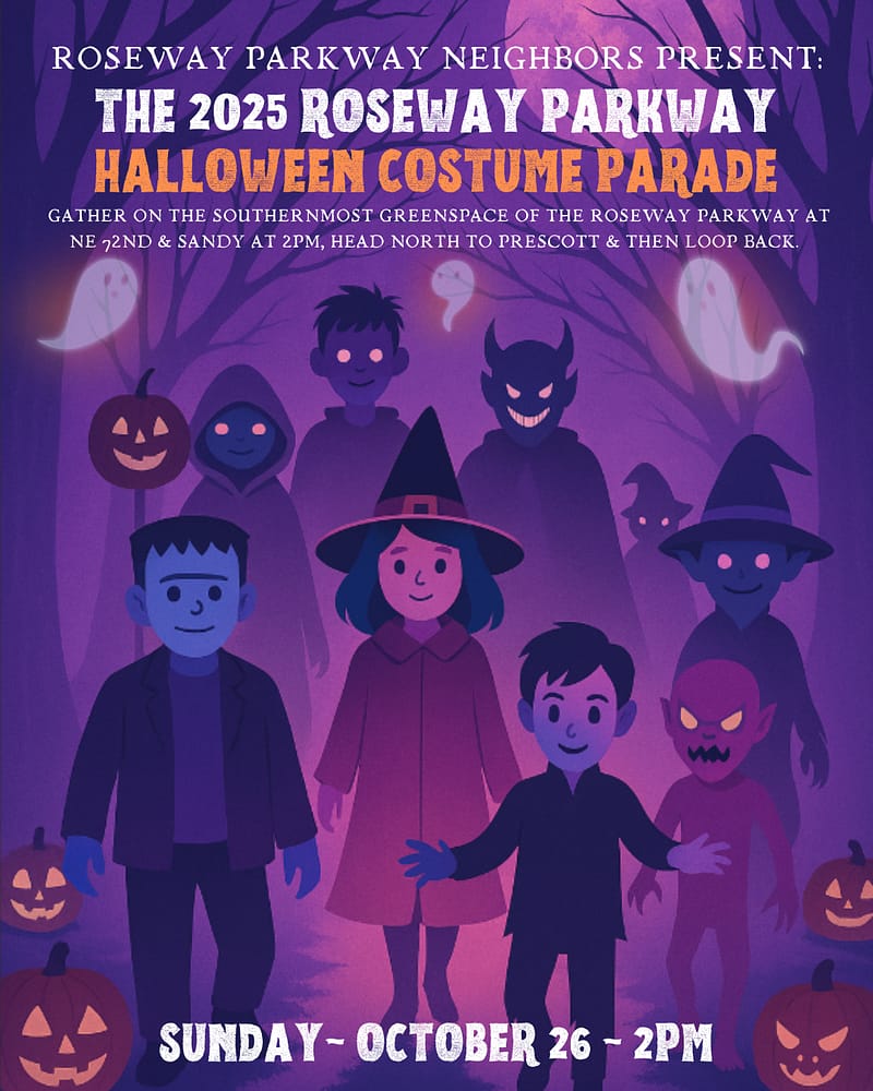 GATHER ON THE SOUTHERNMOST GREENSPACE OF THE ROSEWAY PARKWAY AT NE 72ND & SANDY AT 2PM, HEAD NORTH TO PRESCOTT & THEN LOOP BACK. (Map: https://maps.app.goo.gl/tupDoVFjdEbcpvi89)