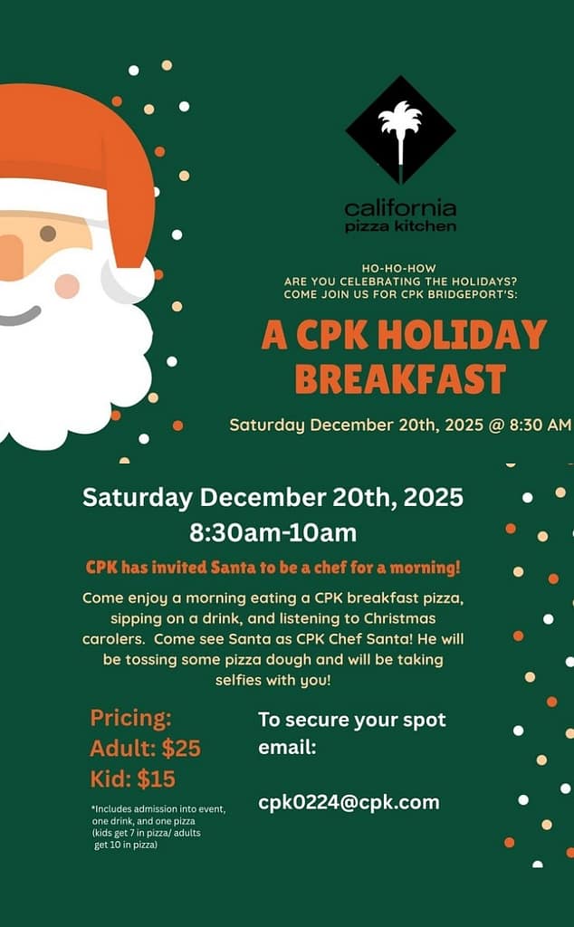 Happy Holidays from California Pizza Kitchen Bridgeport! Head to “A CPK Holiday Breakfast”- on Saturday December 20th, 2025 at 8:30am- 10:30am.