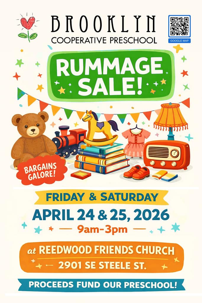 Shop the annual Brooklyn Cooperative Preschool rummage sale and support our school! Our community of families have donated toys, baby gear, other kids’ items, books, clothes, housewares, electronics, furniture, and more to raise funds for our nonprofit school. Shop 9am – 3pm on Friday, April 24 and Saturday, April 25 at Reedwood Friends Church (2901 SE Steele Street, Portland, OR). Full details here: https://brooklyncooppreschool.org/rummage-sale/