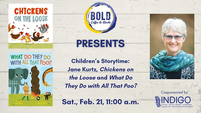BOLD is thrilled to host a special children’s storytime with Jane Kurtz, author of Chickens on the Loose and What Do They Do with All That Poo?