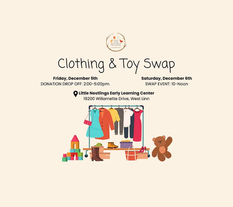 Join us for a winter clothing and toy swap at Little Nestlings Early Learning Center! This free community event is a great way to share gently used items and find new-to-you treasures for the season — including potential holiday gifts for your little ones.