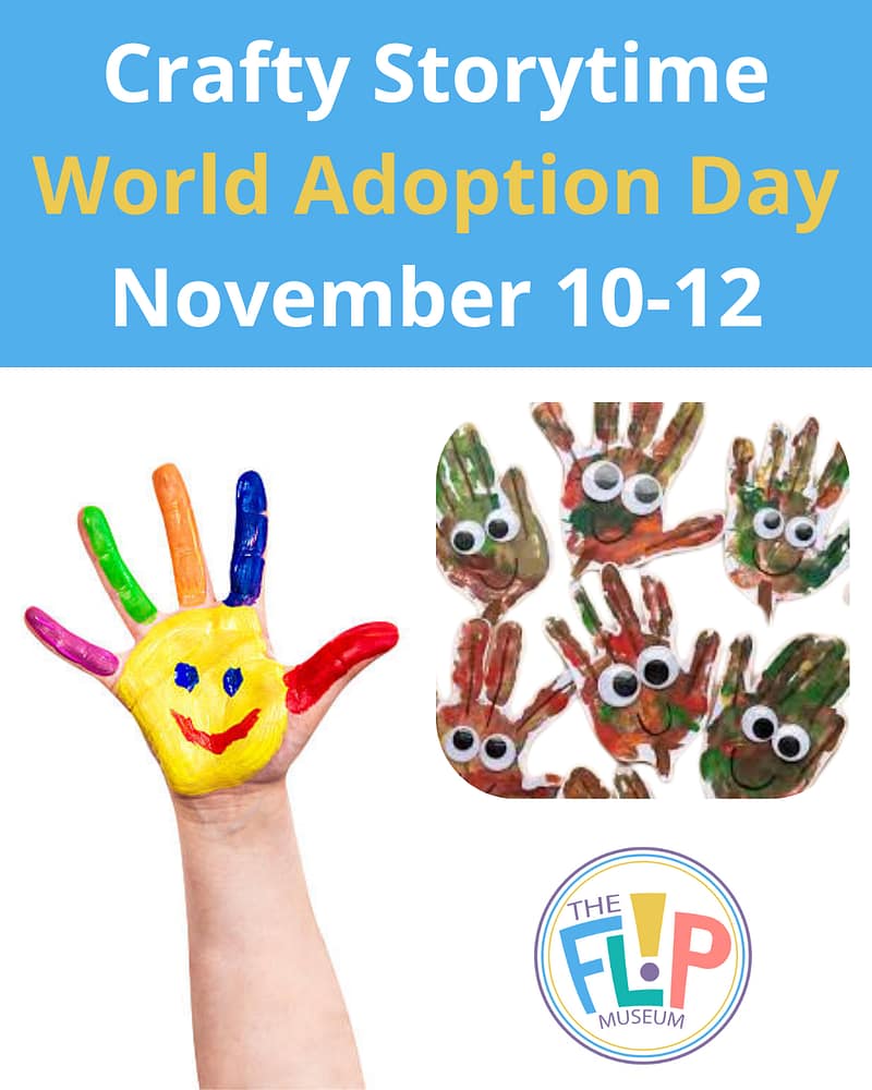 Every Monday-Wednesday at FLIP, we focus on a specific culture, community, or holiday and offer stories and crafts on that theme. This week, we are highlighting World Adoption Day (Nov. 9). Arrive by 10:30 if you want to hear the story. The crafts will focus on hand-art and will be available the whole day, 9:30-1:30.