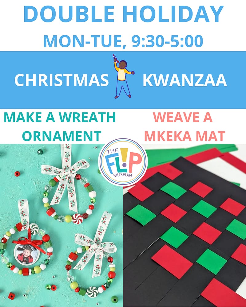 We’re celebrating both Christmas and Kwanzaa this week. Make a wreath ornament and weave a Mkeka Mat and listen to stories about both of these holidays. We’re staying open late too, 9:30-5:00, so everyone can fit this into their winter break.