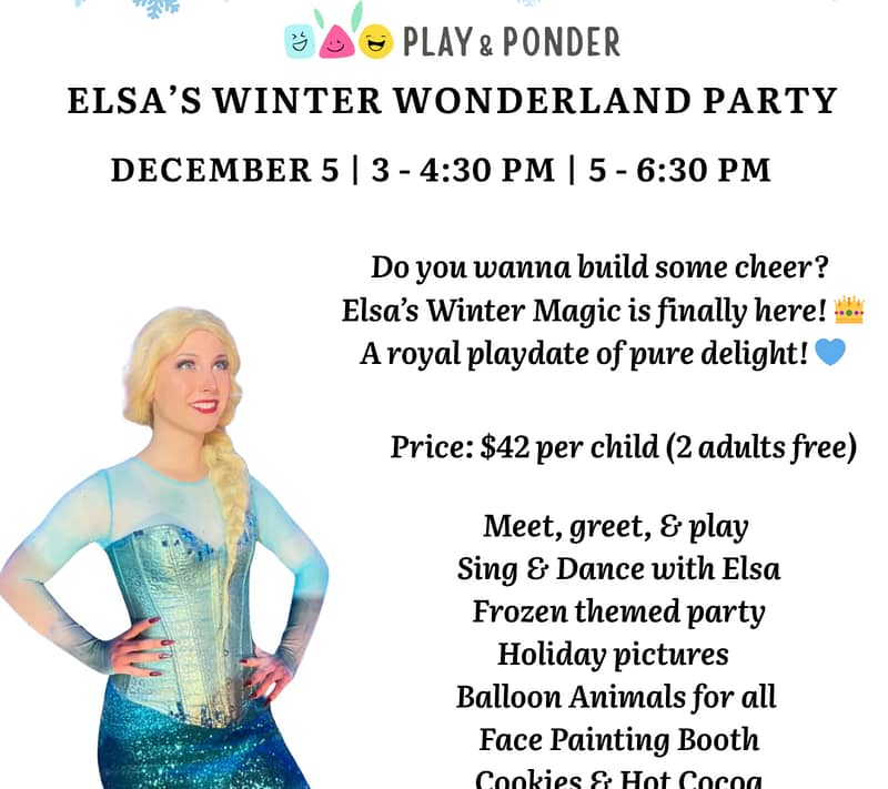 Join Elsa for a magical Winter Wonderland Party at Play & Ponder! Reservations required!
