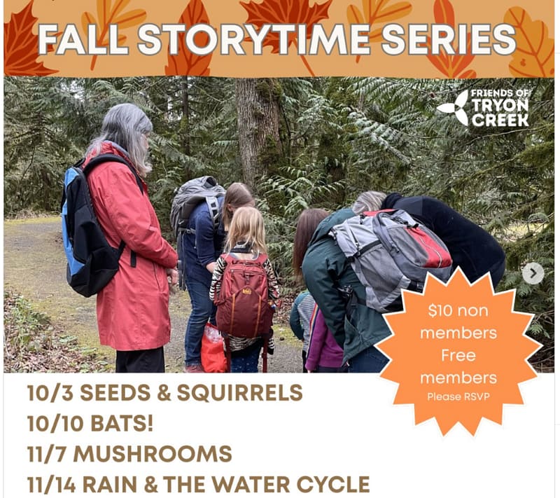Join Friends of Tryon Creek and local author, illustrator, and naturalist Audrey Sauble for a special storytime series. Featuring a variety of nature themes and books, some of which are available to purchase in the Nature Center Store. We will gather near the Nature Center for a story, activity, and walk introducing children (and adults) to forest plants and animals. It is best suited for children 3-5 years old, but all are welcome.