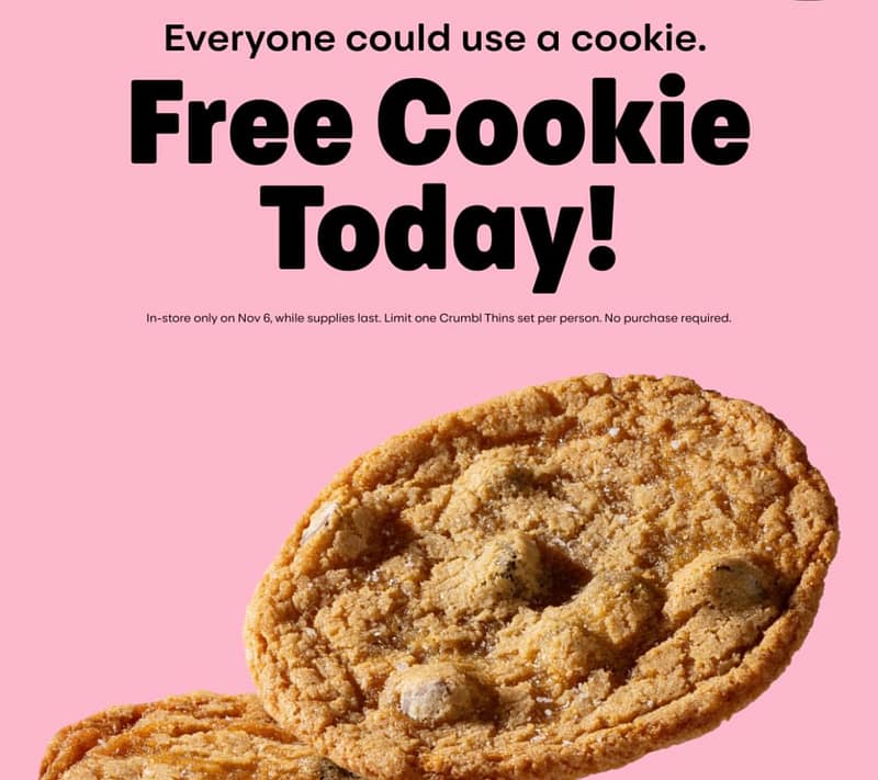 Cookie Crumble is giving away FREE Chocolate Chip Cookie Thins today. Visit a location near you and enjoy a special sweet treat. The one-day deal is intended to be a small act of kindness for customers. Find the store closest to you!