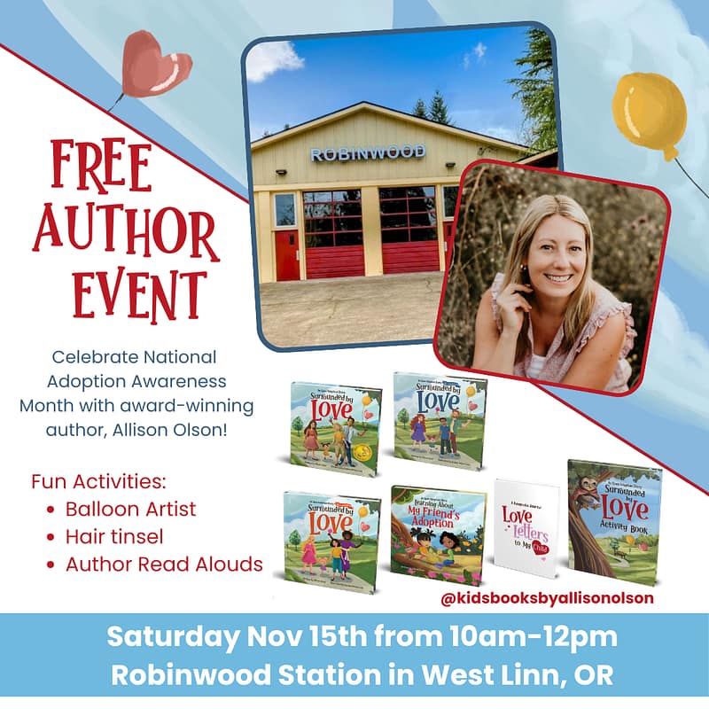 The community event is open to all and will feature fun activities for families, including a balloon artist, a hair tinsel station, and special author read-alouds from Allison Olson’s children’s books, Surrounded by Love: An Open Adoption Story and Learning About My Friend’s Adoption: An Open Adoption Story.