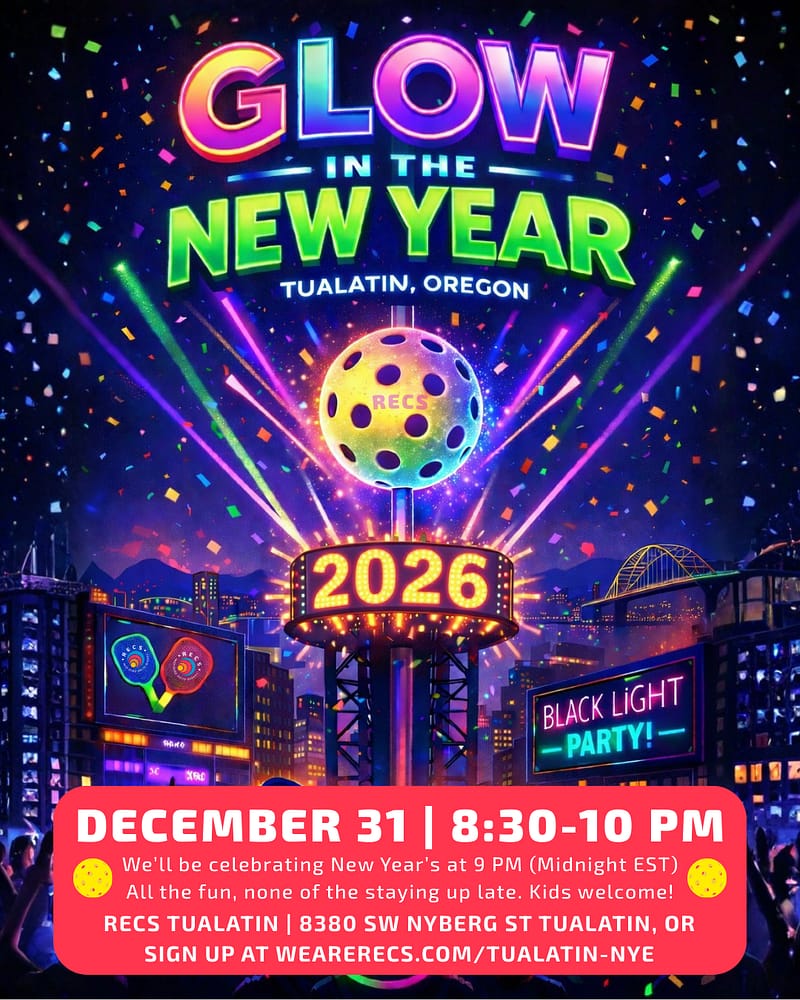 🎉🎆✨ NEW YEAR’S GLOW PICKLEBALL PARTY ✨🎆🎉 Lights DOWN ⬇️ • Energy UP ⬆️ • Vibes ON 🔥 Glow into the New Year with a black light pickleball PARTY! Neon accents 🌈, pumping music 🎶, and nonstop social open play 🎾💥 Wear WHITE + NEON to glow extra bright 💚💖💙 and bring the big energy! ⏰ EAST COAST COUNTDOWN ALERT! ⏰ We’ll be celebrating New Year’s at 9PM (midnight EST) 🥂🎊 — all the fun, none of the staying up late 😴🙌 No pressure 🙌 • All fun 😄 • Big glow ✨ • BIG ENERGY ⚡