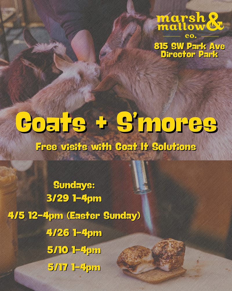 Goat petting zoo is FREE to enter, but please support our sponsor Marsh & Mallow Co. by indulging in some ultra tasty s’mores while you visit the park.