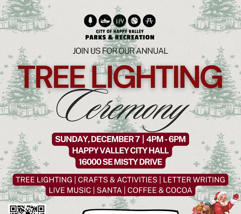 Head to this FREE, family-friendly outdoor event filled with festive cheer. Enjoy live musical performances, seasonal treats, and kids’ activities. Santa will be on hand for photos and, of course, to lead the countdown as we light the tree together. Stroll through community booths, sip hot cocoa, and share the holiday spirit with friends and neighbors. Presented by Happy Valley Parks and Recreation, this annual tradition is the perfect way to celebrate the season.
