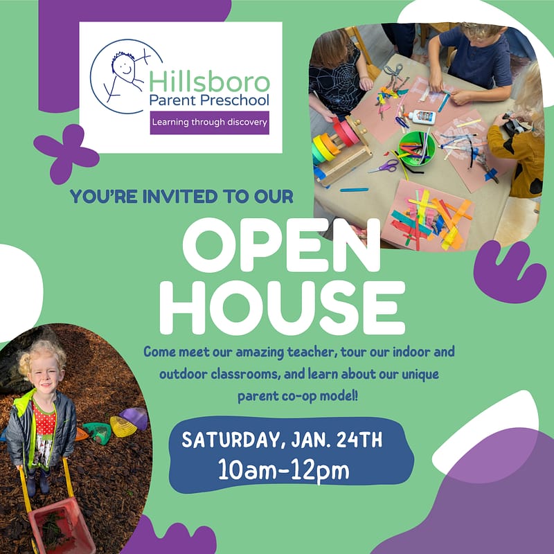 Hillsboro Parent Preschool has been a beloved institution in Hillsboro for over forty years! Located in downtown Hillsboro, HPP is a nurturing environment for children ages 3 to 5 and embraces a child’s inherent love of learning. Both inside and outside our classroom, parents work together to support our educator to create an environment that fosters the whole child. Come and check out our Open House, enrollment for 2026/7 starts Feb. 1st!