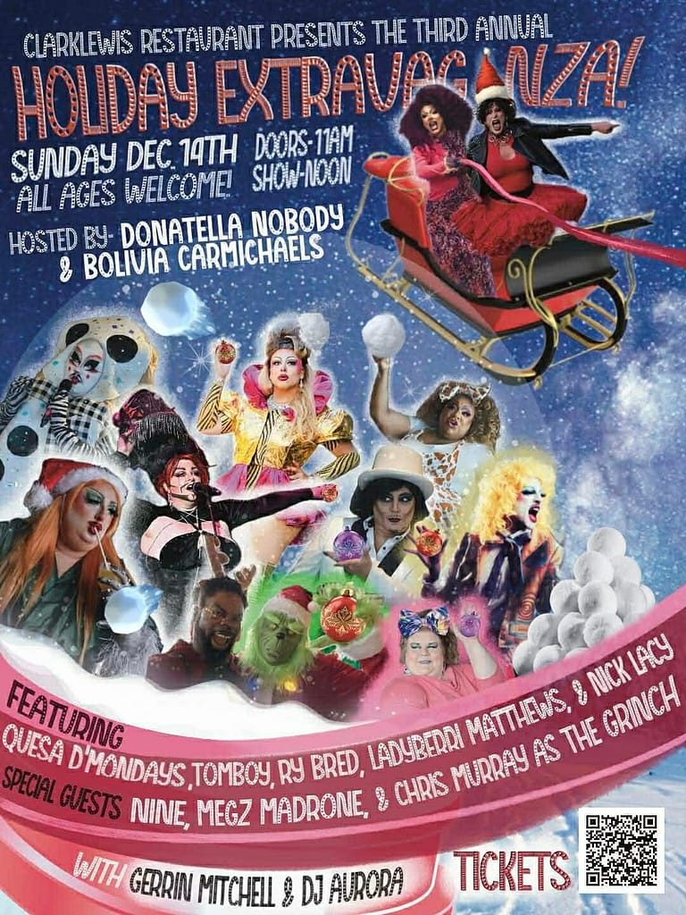 Join us at Clarklewis, situated in the Central Eastside, for our Third Annual Holiday Drag Brunch Extravaganza! Our drag brunch is among Portland’s very best family-friendly drag shows, entertaining and inspiring audiences of all ages. Created and hosted by Donatella Nobody, the alter ego of theatre designer and educator Tyler Buswell, with special guest host, and local drag legend, Bolivia Carmichaels. This show is sure to be jam packed with merriment, joy, laughs and heart as the most incredieble drag talent entertains you!