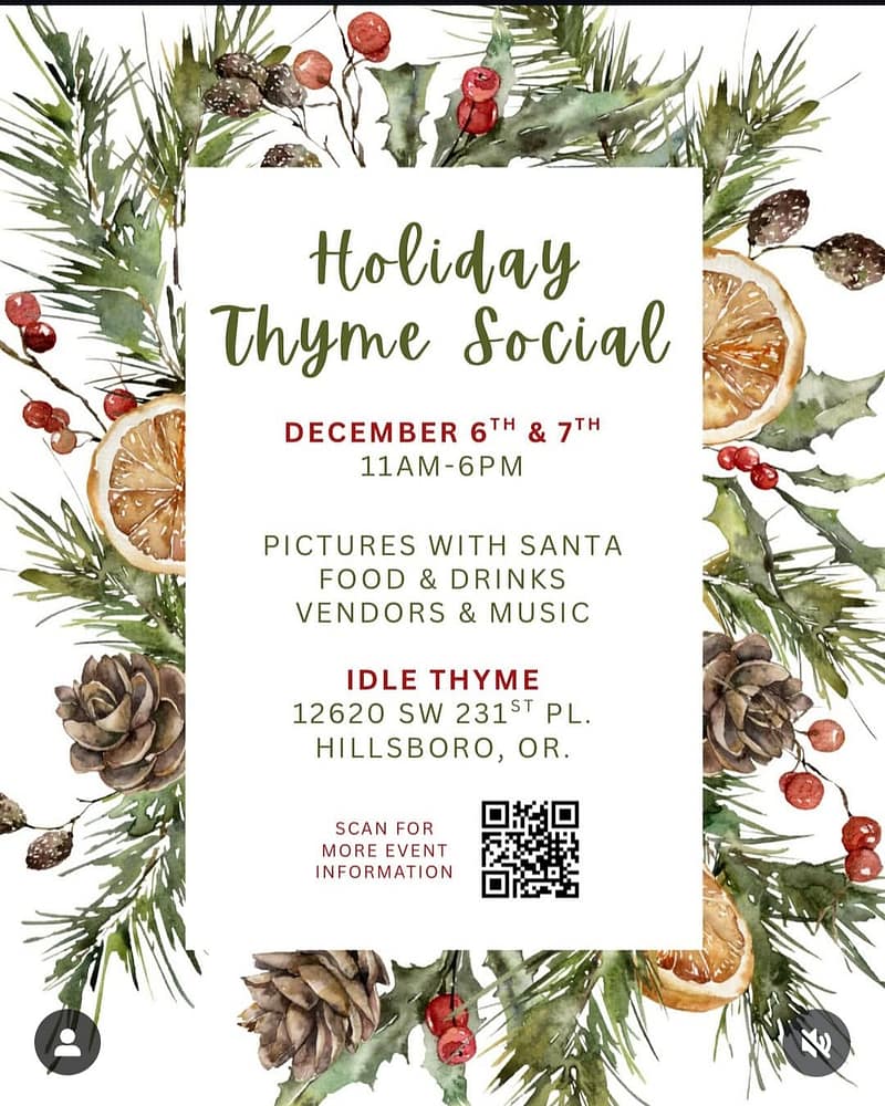 We are hosting a Holiday Social at our place, Idle Thyme Farm & Events. Come see Santa and get your photo with him, drop off a letter to the north pole, enter a raffle, coloring contest and more! Shop local vendors and grab a yummy lunch or warm drink!
