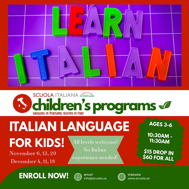 Join us this fall and winter for and fun and playful Italian language class inspired by our Saturday Class but designed for busy families who can’t attend on weekends. Introduction to Italian through songs, games, and movement. All levels are welcome, from beginner to fluent speaker. This is a drop off class. Register Here.
