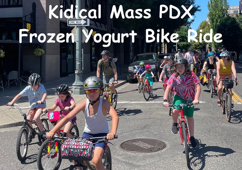 Celebrate the 18th anniversary of Kidical Mass PDX with a bike ride downtown to get frozen yogurt! This family-friendly, kid-paced bike ride was founded in June 2008 on a route downtown similar to this one, ending at an ice cream shop.