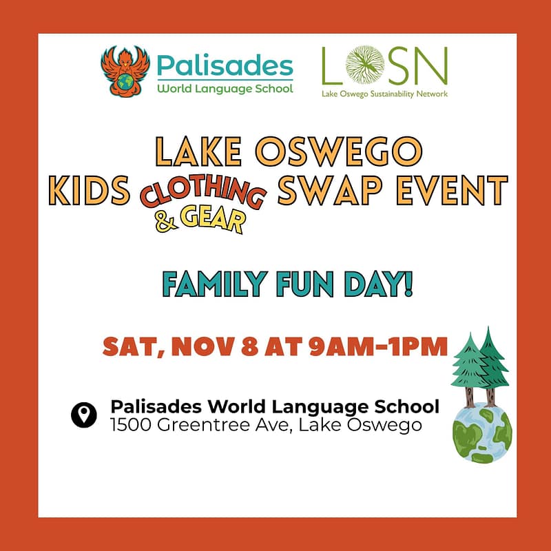 Palisades World Language School PTO and Lake Oswego Sustainability Network present a community swap event to bring families together to reuse and share gently used children’s clothing, shoes, books, toys and sports equipment. Everyone is welcome – you don’t need to bring items to join the swap. Suggested monetary donations: $25 to fill a bag of clothing and donate as you wish for other individual items.