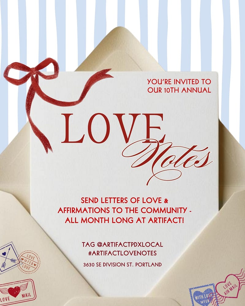 Now through the end of February, we invite you to stop by Artifact to write a love letter to our community. Every note will be displayed in our front window throughout the month, creating a shared tapestry of kindness and connection.
