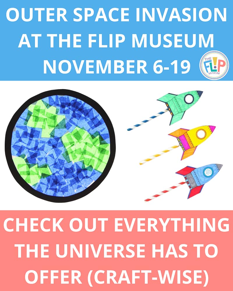 We’ve got to start locking our doors! Every few weeks, The FLIP Museum experiences a TAKE OVER. This week, it’s OUTER SPACE. Yes, the infinite, ever-expanding universe has stopped by and wants to make art with you. It seems nice enough. Come check out all the activities – great for preschool and grade-school-aged kids.