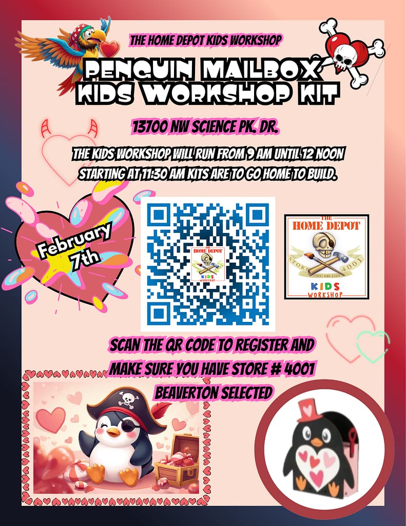 The Home Depot Kids Workshops is a free hands-on learning experience that encourages skill-building and creativity in children ages 5-12. Skills such as following step-by-step instructions, working with hand tools like hammers and screwdrivers, and painting. The Workshops are hosted by store associates who also serve as Workshop Captains. Children should be accompanied by a parent or guardian to assist them with completing the workshop kit. The time for completing the kits varies but usually takes 30 minutes. Each child can bring home a newly constructed project, a Kids Workshops apron, an achievement pin, and a certificate. These Workshops are held on the first Saturday of each month, starting at 9am until noon.