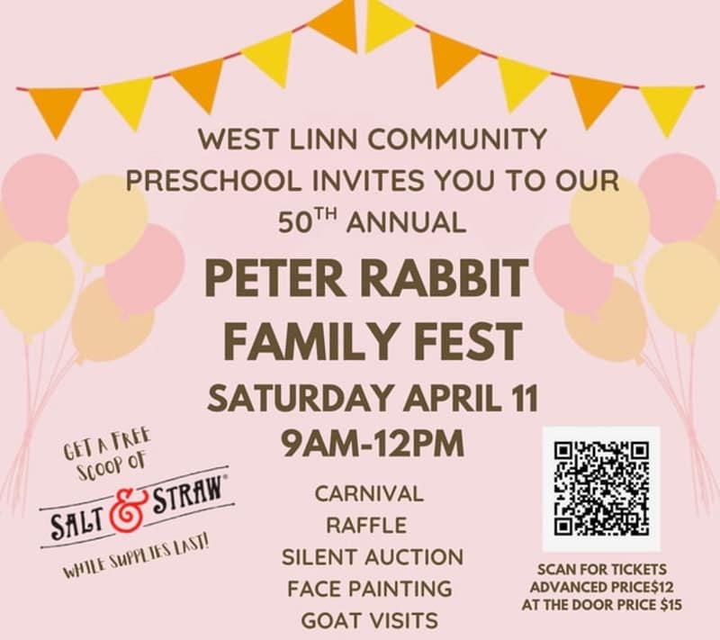 You are invited to join us for West Linn Community Preschool’s 50th annual Peter Rabbit Family Fest on Saturday, April 11th from 9am-12pm! We will have kids carnival games, raffle, local food vendors (Kelly’s Tacos, Kona shave ice, cotton candy) and free scoops of salt and straw ice cream! Also, the fire department and police departments will be stopping by, as well as phoots with Peter Rabbit! Hope to see you there!