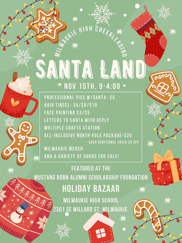 Visit Santa Land at the Milwaukie High School Holiday Bizarre, Saturday 11/15 9-4:00.