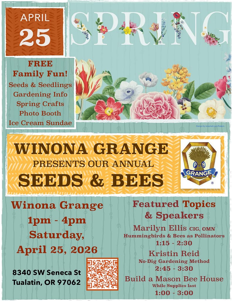 Free seeds and takeaways to welcome pollinators will highlight an afternoon of family fun and learning Saturday, April 25 at Winona Grange in Tualatin, 1-4 pm. The goal is to celebrate the role pollinators play in our lives and raise community awareness about pollinator health. Tips also available for new and experienced gardeners alike. Free ice cream sundaes will top off the event.