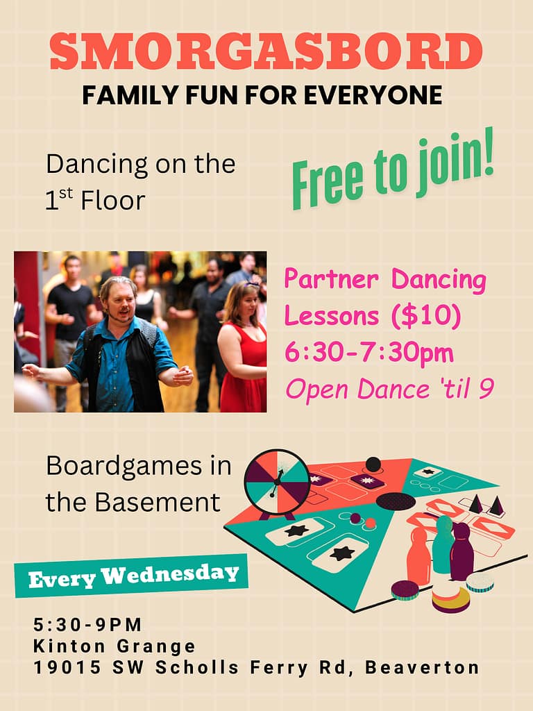 We are building an exciting community event unlike any other! It’s a little bit board games, a little bit family dance party, a little bit dance lessons, and a lot of what you want to help us make it! So, what were we going to call it other than Smorgasbord?