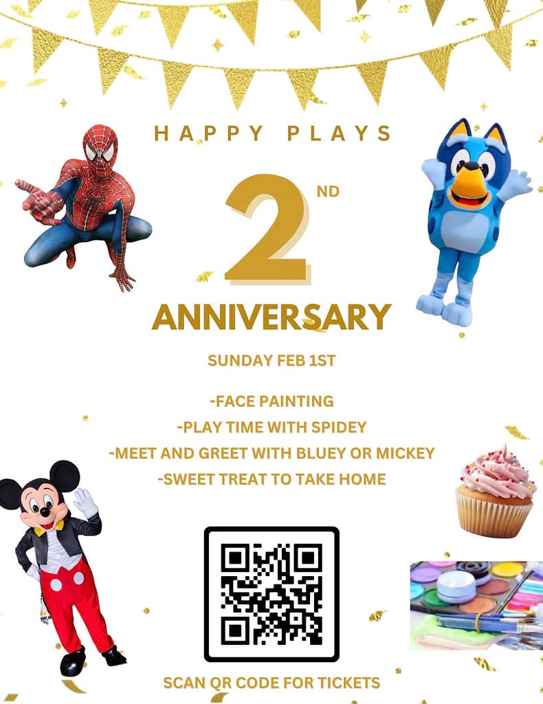 Come celebrate Happy Play turning 2! We are so excited to celebrate 2 whole years of being open to our amazing community and all of the surrounding ones! Enjoy 1.5 hours of playtime where your little one will get the chance to play with Spidey, have a meet and greet with Mickey, enjoy face painting and a sweet treat!