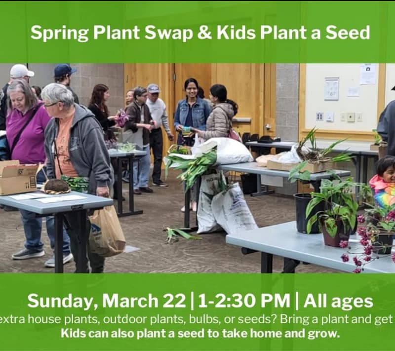 Have extra house plants, outdoor plants, bulbs, or seeds? Bring a plant and get a plant! Kids can also plant a seed to take home and grow. All ages.