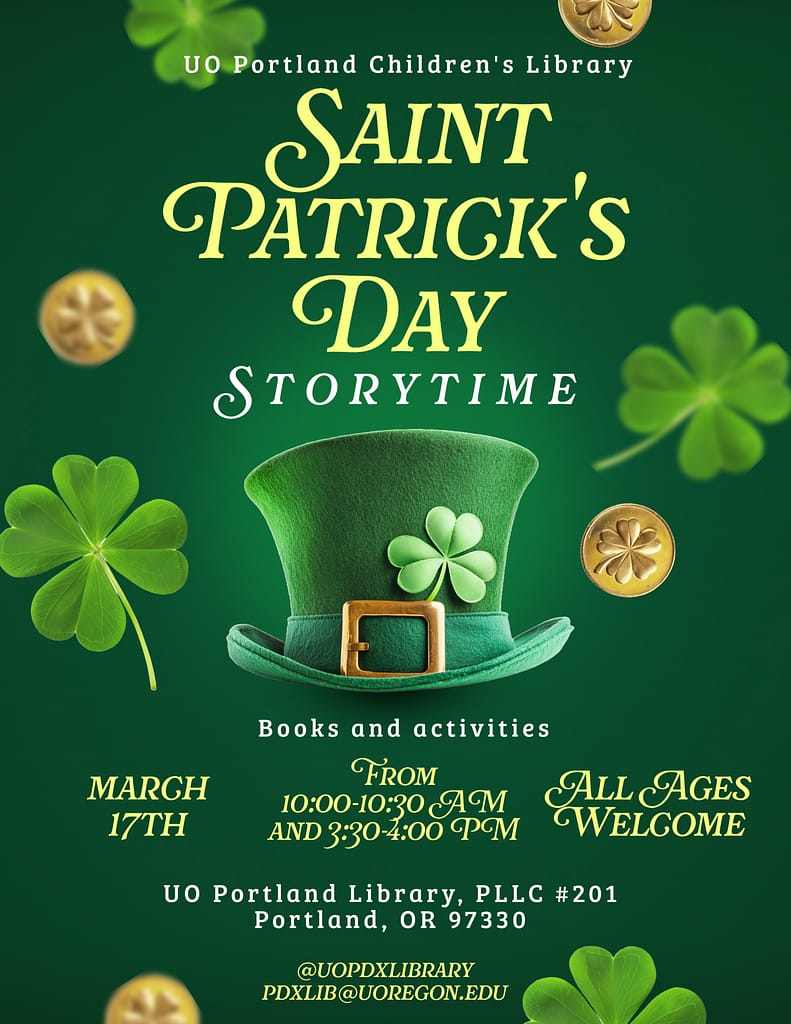 Join us on Tuesday, March 17, for St. Patrick’s Day Storytime! There will be 2 storytime sessions, one at 10:00 a.m. and one at 3:30 p.m.