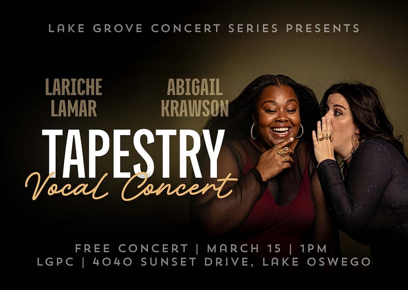 Grab your bestie and enjoy the diverse playlist of acclaimed singers, Abigail Krawson and LaRiche Lamar. This classically trained duo draws their inspiration from all styles of music, exploring everything from pop and indie, to musical theater and opera. Tapestry concerts weave together the complexities of human emotions through song. It is inspirational and empowering for all ages! Come for the music, stay for the community!
