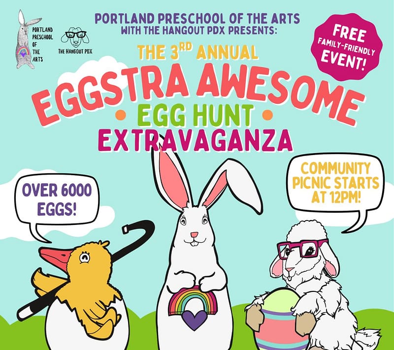 It’s time for the 3RD ANNUAL EGGSTRA AWESOME EGG HUNT EGGSTRAVAGANZA, hosted by PORTLAND PRESCHOOL OF THE ARTS!