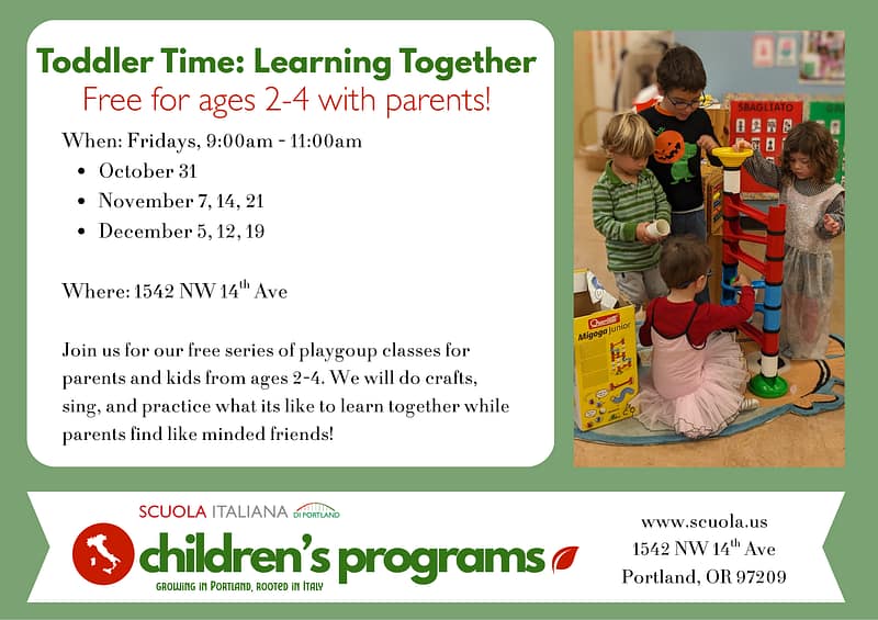 Join us for our free Toddler Time: Learning Together parent-child classes for ages 2-4! This is a fun way to introduce preschool style learning alongside a parent/caregiver in a fun, relaxed environment. We will play, do crafts, learn a little Italian together, and make community! We hope you can join on the following Friday mornings:
