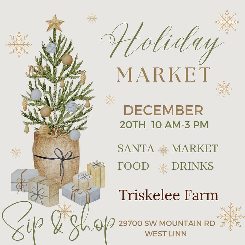 Triskelee Farm Holiday Markets Come join us at Triskelee Farm for our Holiday Market on December 20th at 10:00 AM till 3 pm. Enjoy tasty food, drinks, a local products! Walk the farm and see our ostrich, alpacas and more!