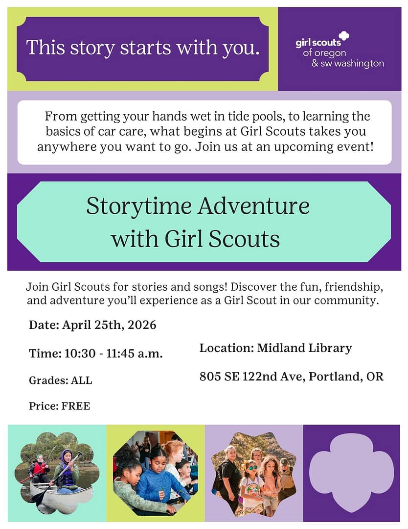 Come join us at Midland Library on April 25 at 10:30 a.m. for a Storytime Adventure with Girl Scouts! Discover the fun, friendship, and adventure you’ll experience as a Girl Scout in our community. The story starts with you! Editor’s note: This event is a community submission.