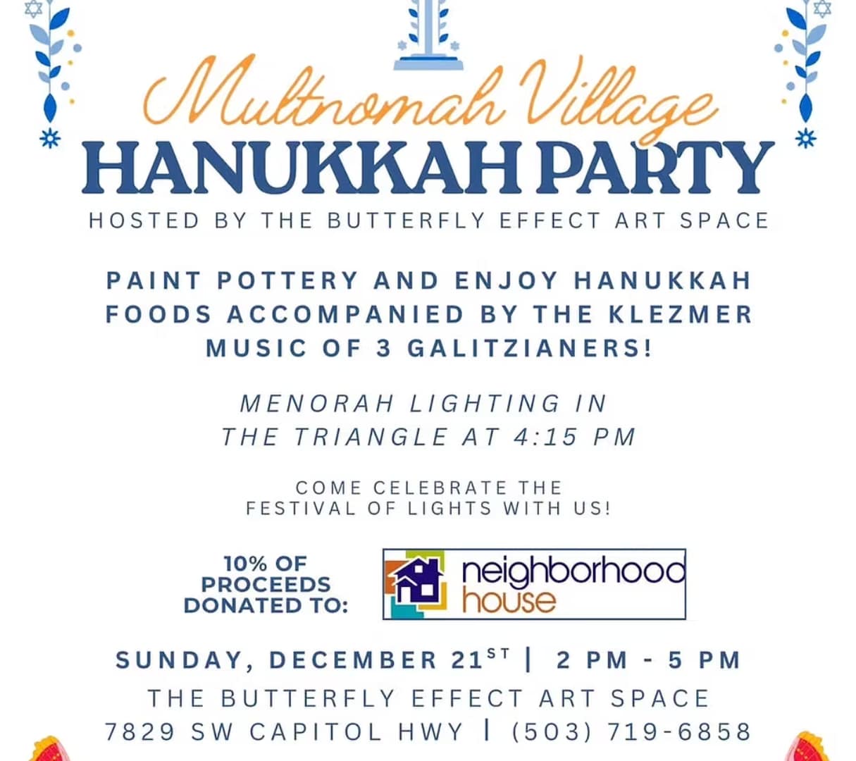 Gresham Arts PlazaGiant Menorah Lighting Special performance by amazing five piece Klezmer band The Carpathian-Pacific Express Hot Latkes & treats Chanukah Shop Dignitaries RSVP appreciated at: www.jewishgresham.com/light