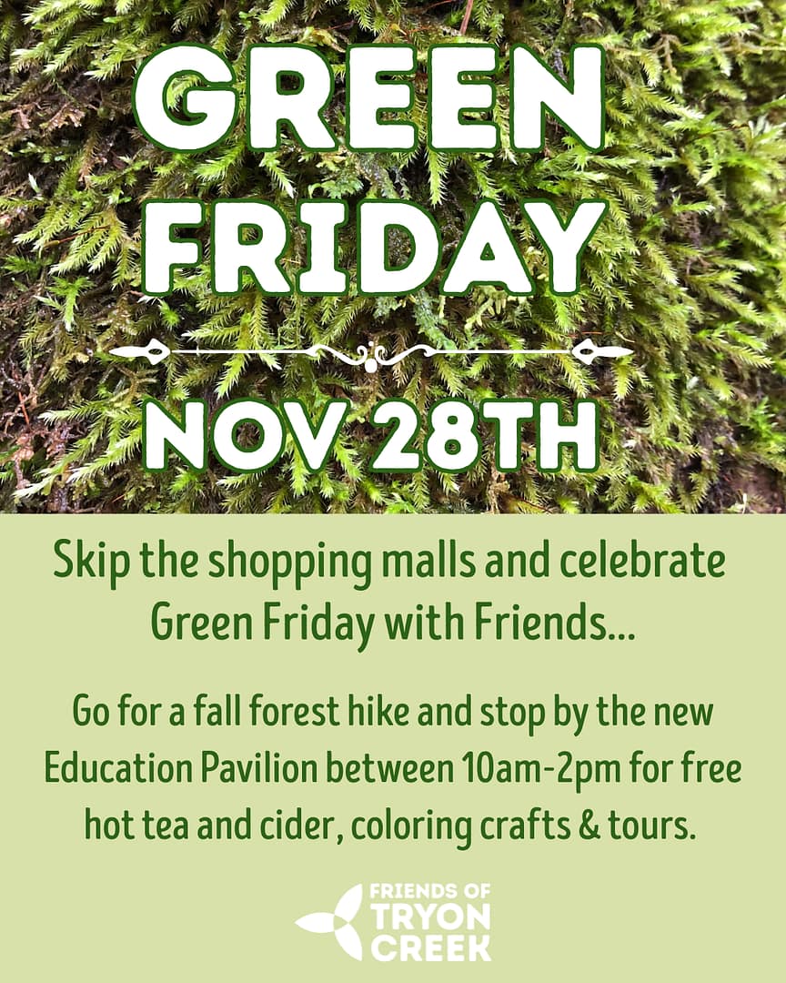 Skip the shopping malls and celebrate Green Friday outside with Friends! Staff and volunteers will be in the new Education Pavilion with with: Hot tea and cider Coloring crafts Building tours No need to RSVP, just stop in before or after your fall hike.