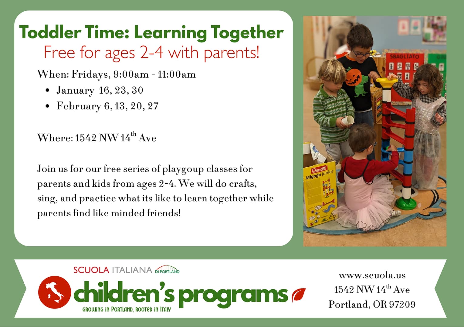 Join us for our free Toddler Time: Learning Together parent-child classes for ages 2-4! This is a fun way to introduce preschool style learning alongside a parent/caregiver in a fun, relaxed environment. We will play, do crafts, learn a little Italian together, and make community! We hope you can join on the following Friday mornings: […]