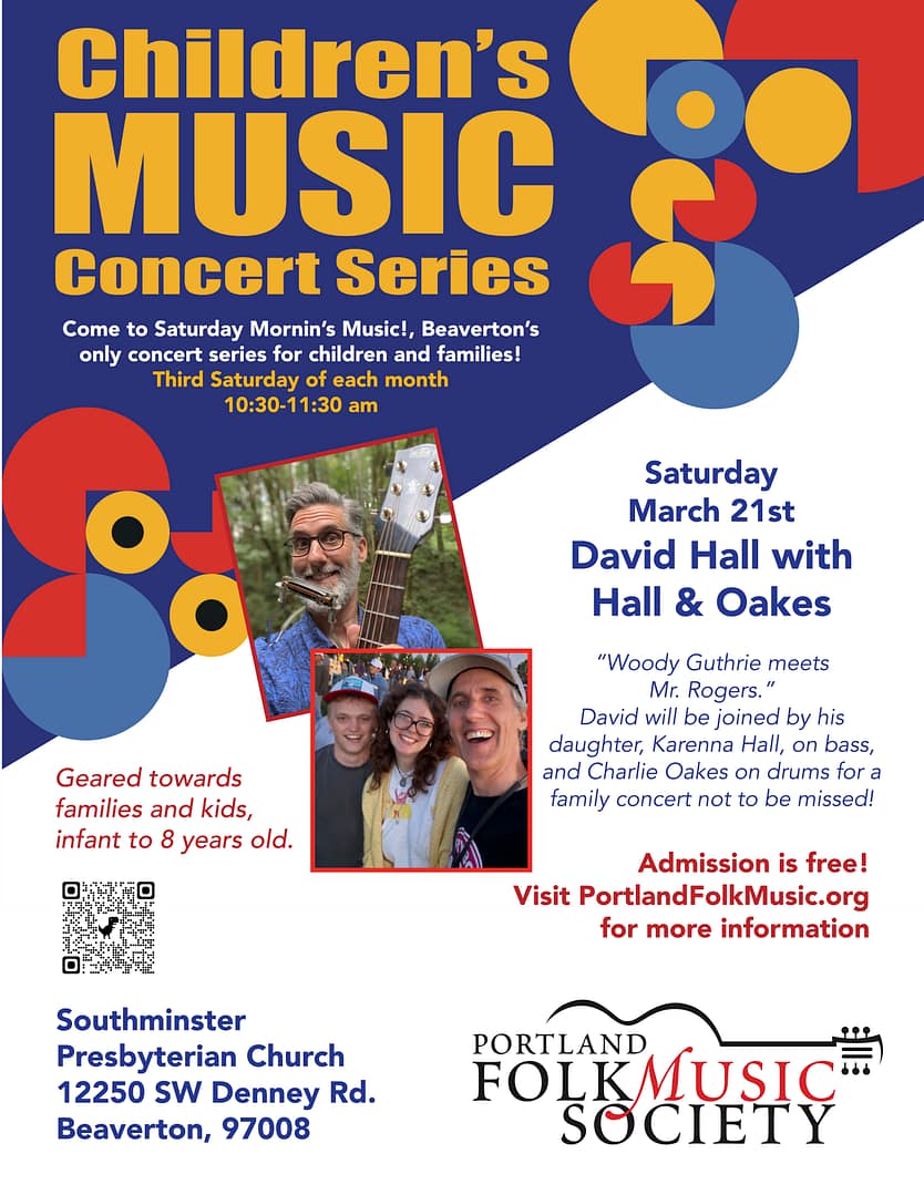 Hall & Oakes is veteran Portland-based children’s musician David Hall with his daughter Karenna Hall on electric bass and Charlie Oakes on trap drum set, bringing world-premiering family band fun to “Saturday Mornin’s Music!,” Beaverton’s only monthly concert series for children. Described as “Woody Guthrie meets Mr. Rogers,” Hall writes up-tempo, silly, and poignant songs […]