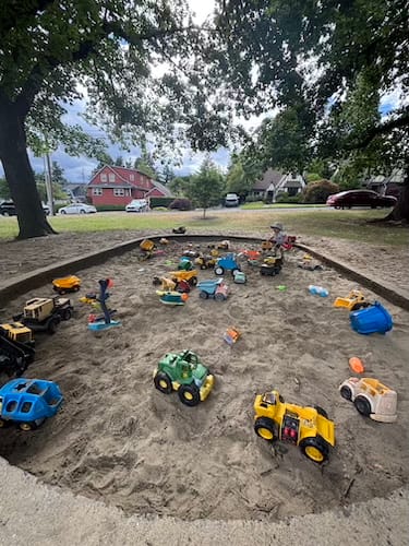 The park that started it all! Neighbors and families have donated toy cars, trucks, tractors and more over the years, and the playground’s sandbox has an impressive amount of toy vehicles. Every time we’ve visited, there are kiddos of all ages digging and playing.
