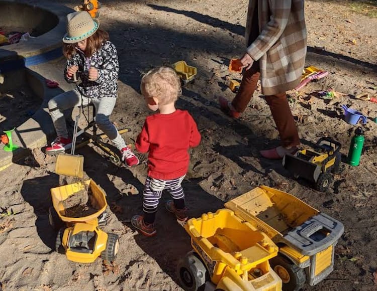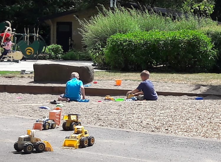 Not only does this Lake Oswego playground have a sandbox filled with car toys and trucks, there’s also a toy excavator that kids can move, scoop and dump sand. It’s definitely a favorite feature at the playground.