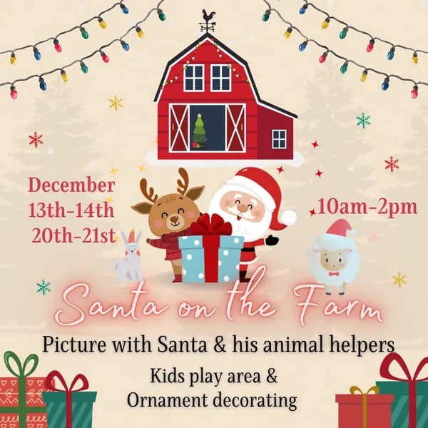 Meet Santa and his adorable animal helpers at Triskelee Farm! ππ Kids can visit Santa for a photo (10:30β1:30 pm), bounce in the bounce house, climb the hay pyramid, dig in the corn pit, and make an ornament to take home. Everything is under cover, so itβs rain-or-shine fun! Adults + carried babies can roam the farm for free, and families are welcome to take their own photos. Food and drinksβincluding burgersβare available for purchase.