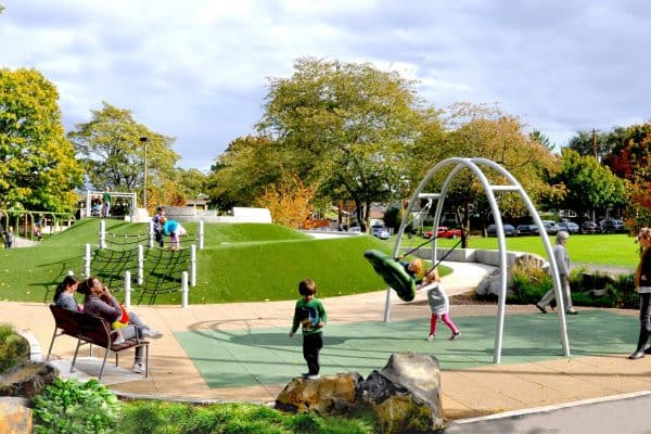 Ending Westmoreland Park’s multi-year winning streak for the fourth year in a row is the inclusive playground at Gabriel Park in SW Portland. There’s even an in ground trampoline you can wheel or walk onto! And the soft-surface ground is perfect for crawlers, too.