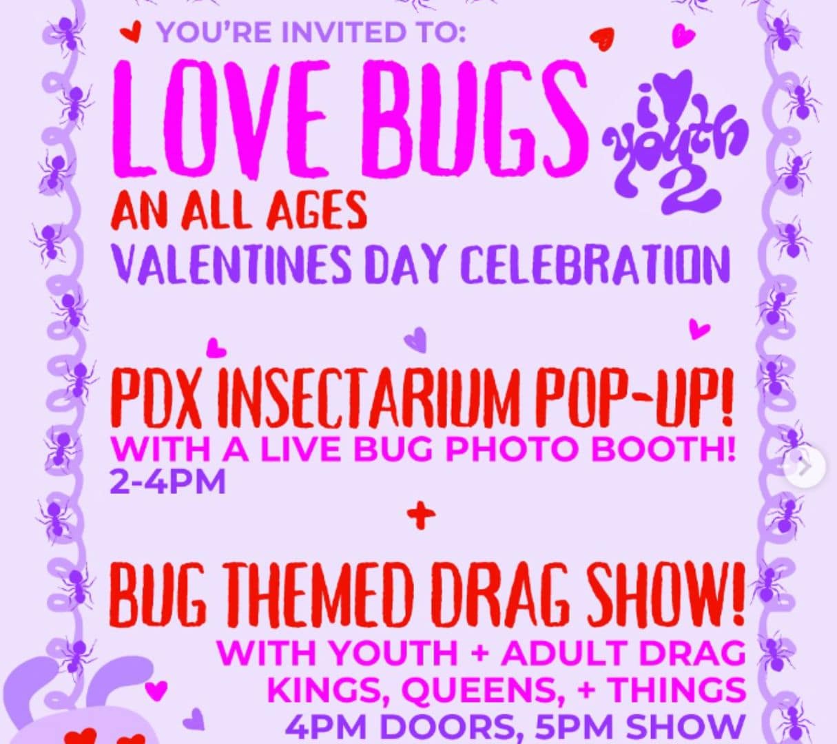 ILYouth2 and the Portland Insectarium are stoked to be bringing you ❣️🪲LOVE BUGS🐝💕 an all ages Valentines Day celebration!!!!! 📸🐛 LIVE BUG PHOTO BOOTH 2-4pm $5 per edited photo (funds go to the Insectarium!) 🕷️👀 LIVE BUG POP-UP 2-4pm $5-10 to see the bugs (funds go to the Insectarium!) 🐞👑 BUG THEMED DRAG SHOW 4pm […]