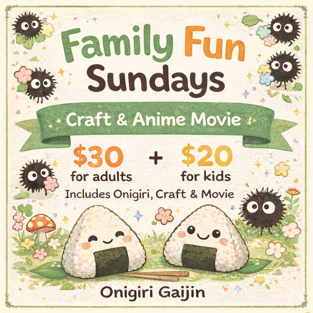Join us at Onigiri Gaijin for Family Fun Sundays—a cozy, creative experience for all ages! Each week features a hands-on craft led by a local artist paired with a themed anime movie (such as: make your own soot sprites inspired by a Ghibli classic). Enjoy delicious onigiri while you create, relax, and spend quality time […]